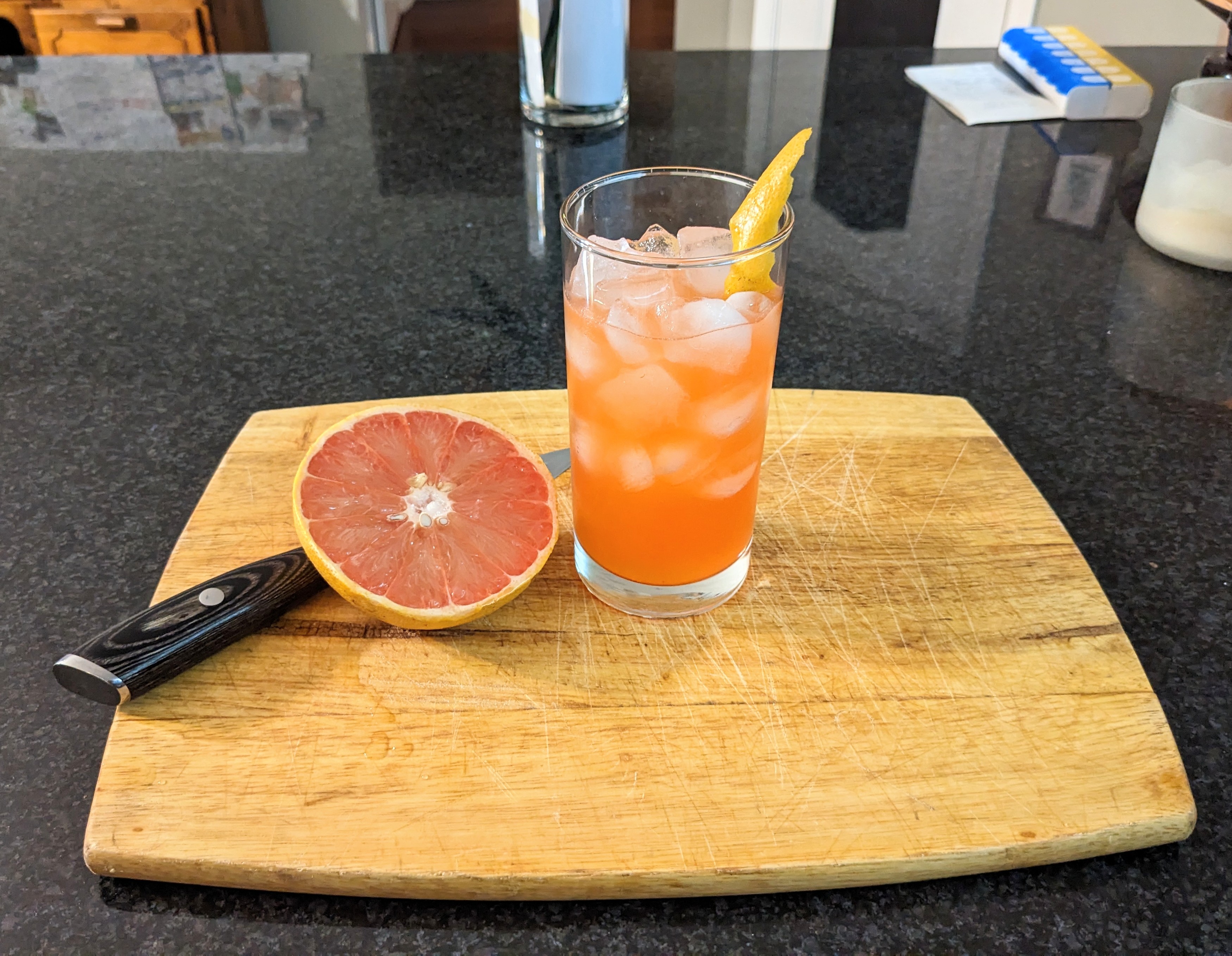 2 oz aged tequila 1 oz Aperol 2 oz grapefruit juice Shake all ingredients with ice and strain into a tall ice-filled glass. Garnish with a twist of orange or grapefruit.