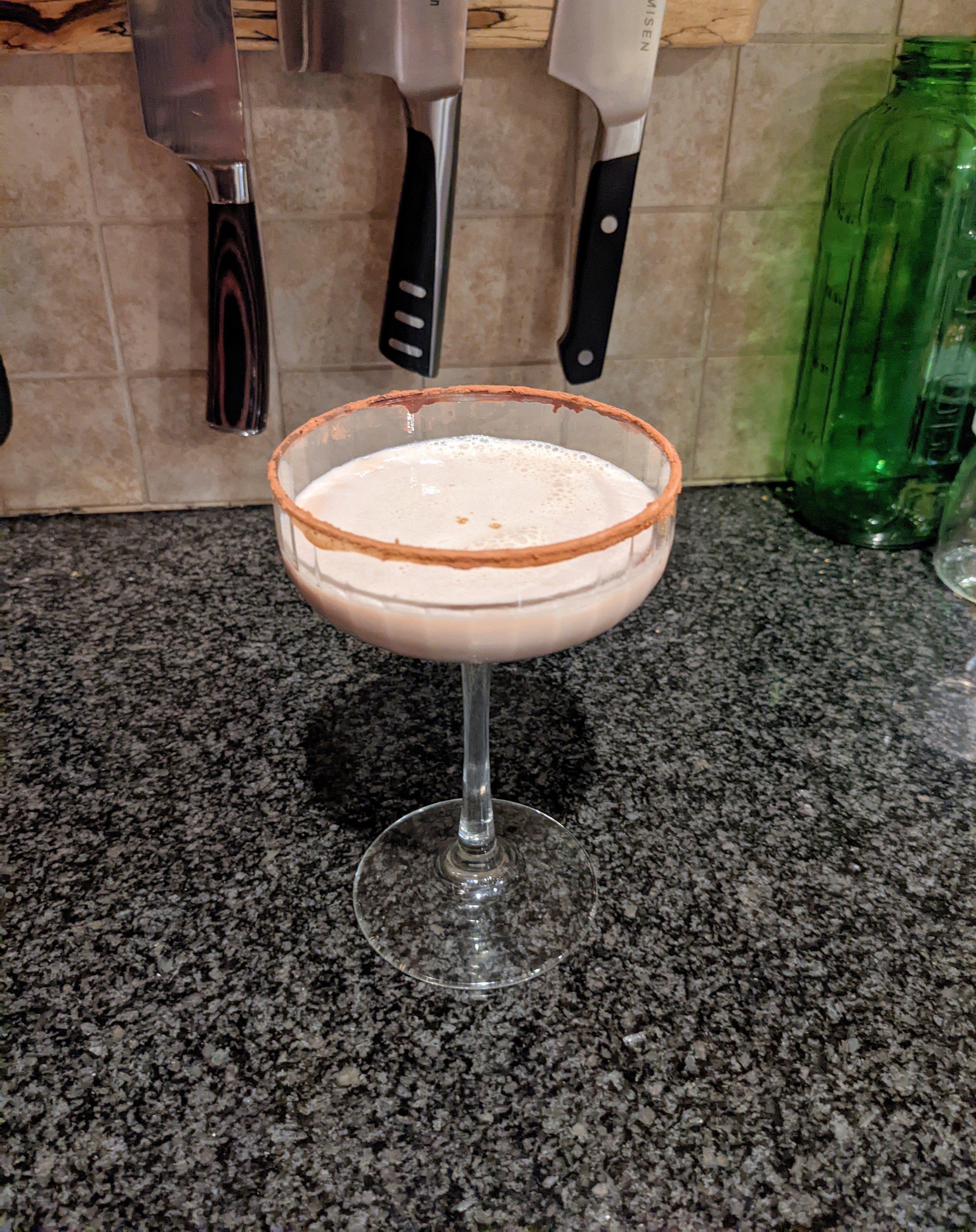 Add a small amount of chocolate liqueur into a small rimmed plate. Add a small amount of cocoa powder to another plate. Dip the rim of an inverted cocktail glass into the liqueur, then into the cocoa powder. Set aside.