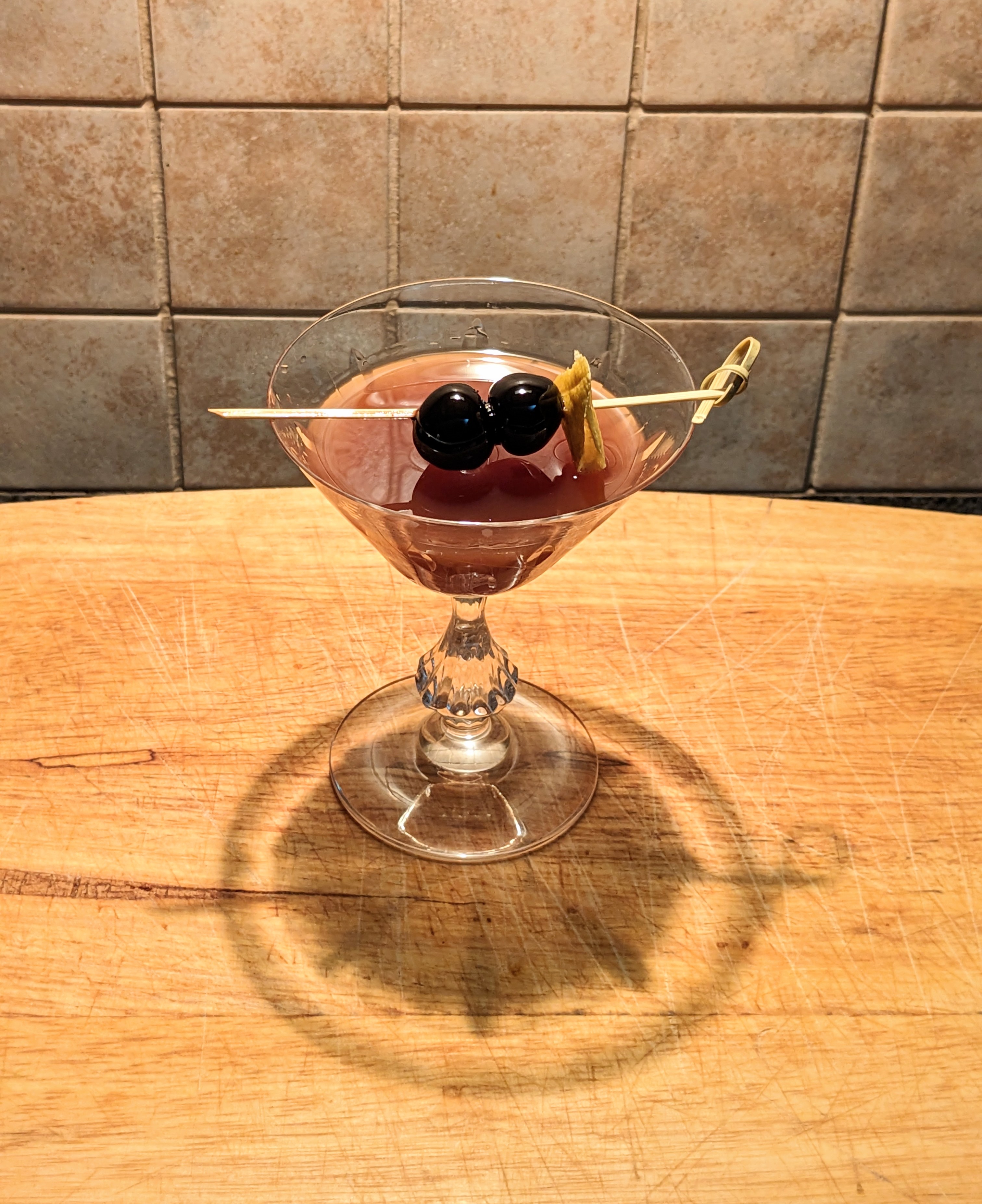 Combine all ingredients in a mixing glass with ice and stir until chilled. Strain into a Nick & Nora glass. Garnish with a lemon twist and two Luxardo cherries.