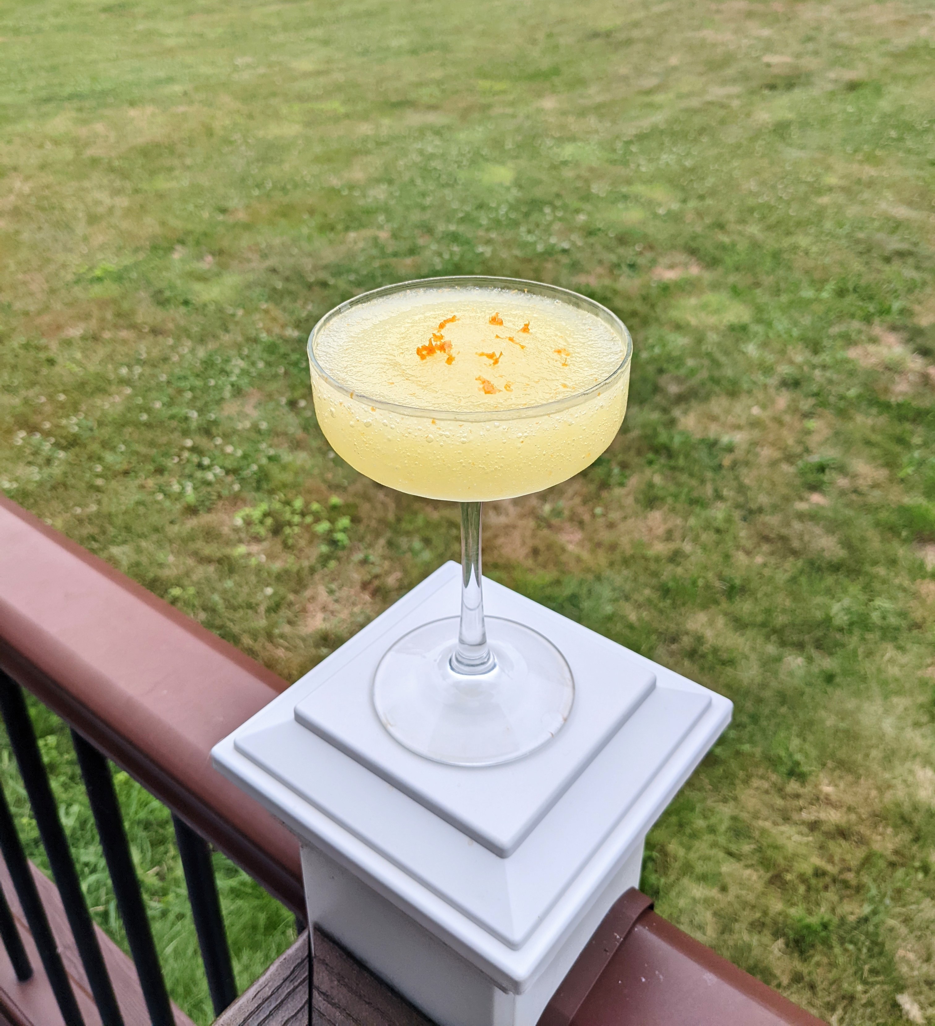 Pour into a coupe and garnish with orange zest.