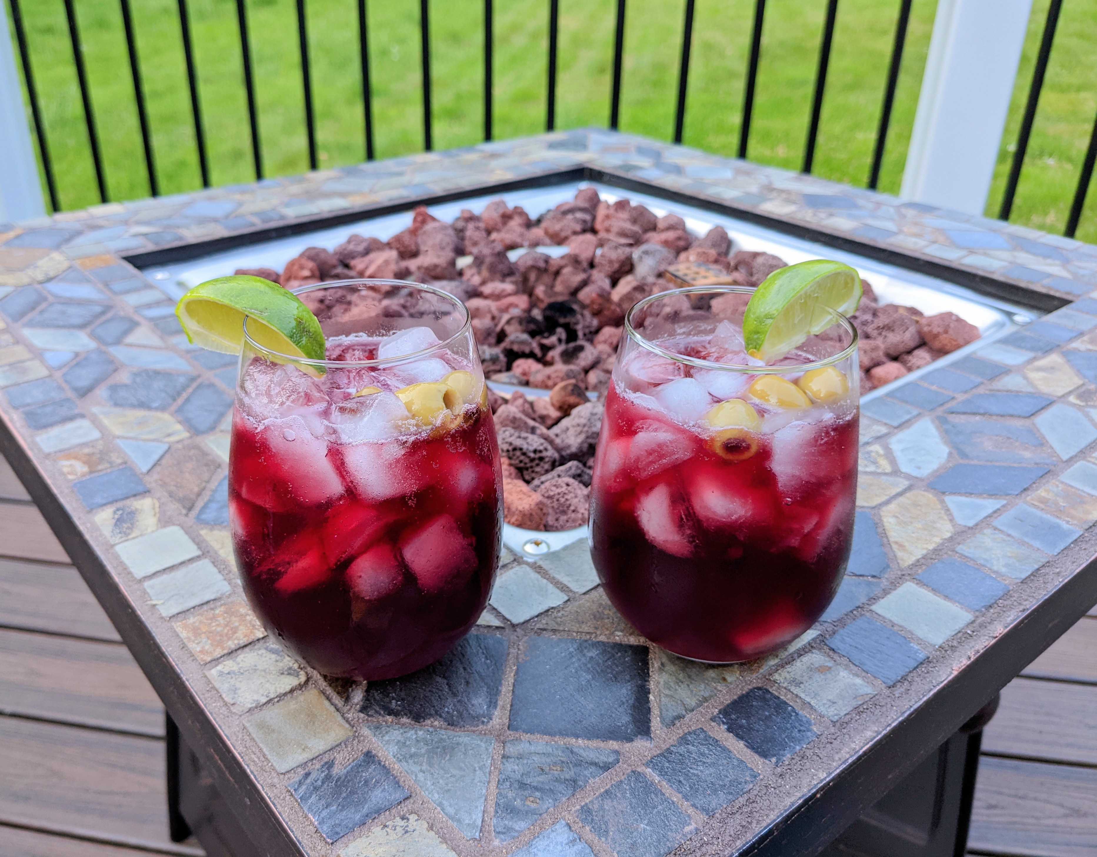 Add the amaro and grapefruit juice to an ice-filled wine glass or lowball glass. Pour the Lambrusco and sparkling water over top. Stir gently, then add the grapefruit wedge. Add in the olives to taste. Serve immediately.
