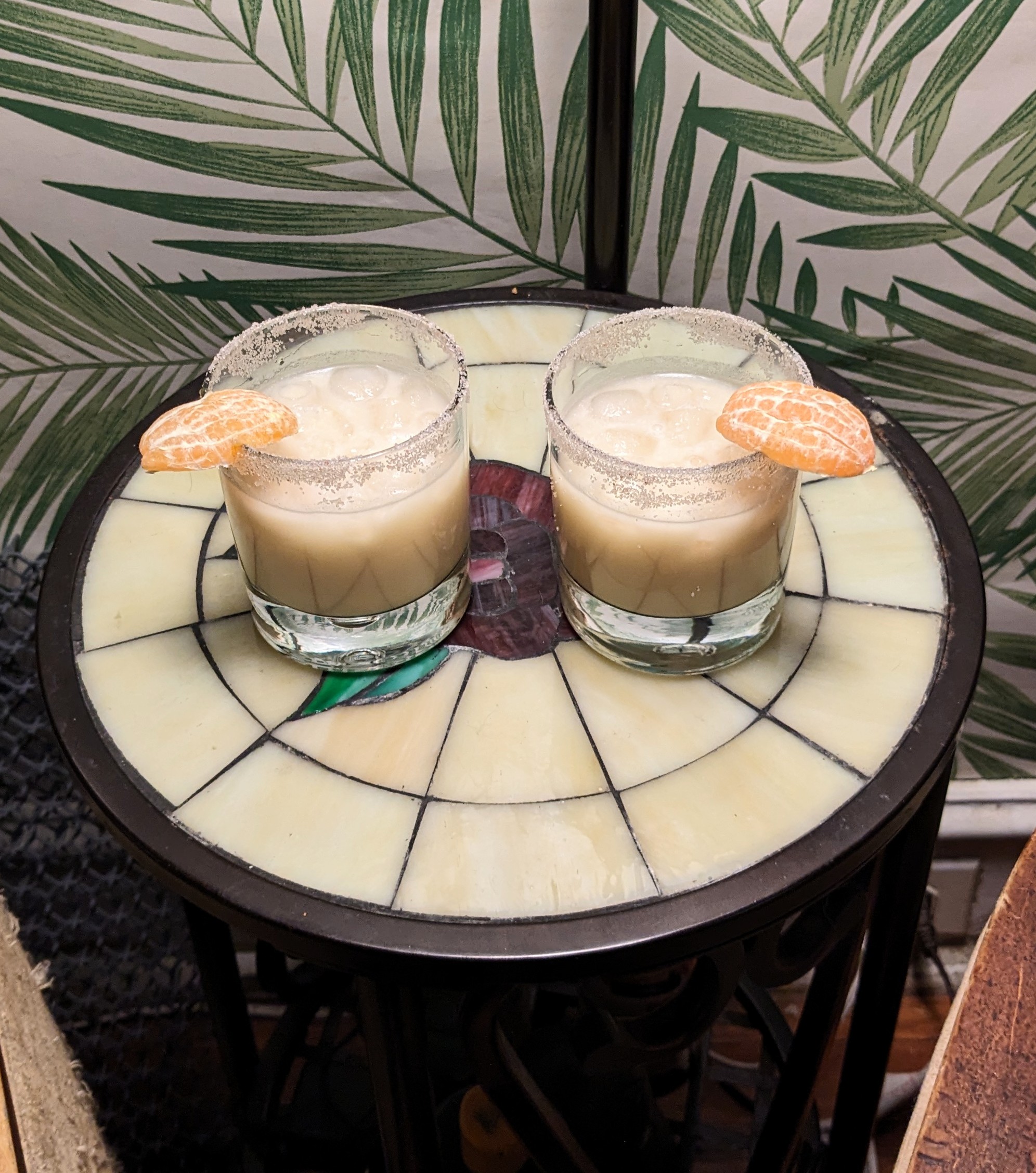 Add mandarin slices and lime juice to a cocktail shaker and muddle. Add in the rest of the ingredients, add ice, and shake for 7 seconds. Rim a glass with agave and coconut sugar. Double strain the cocktail into the glass over ice. Garnish with fresh mint