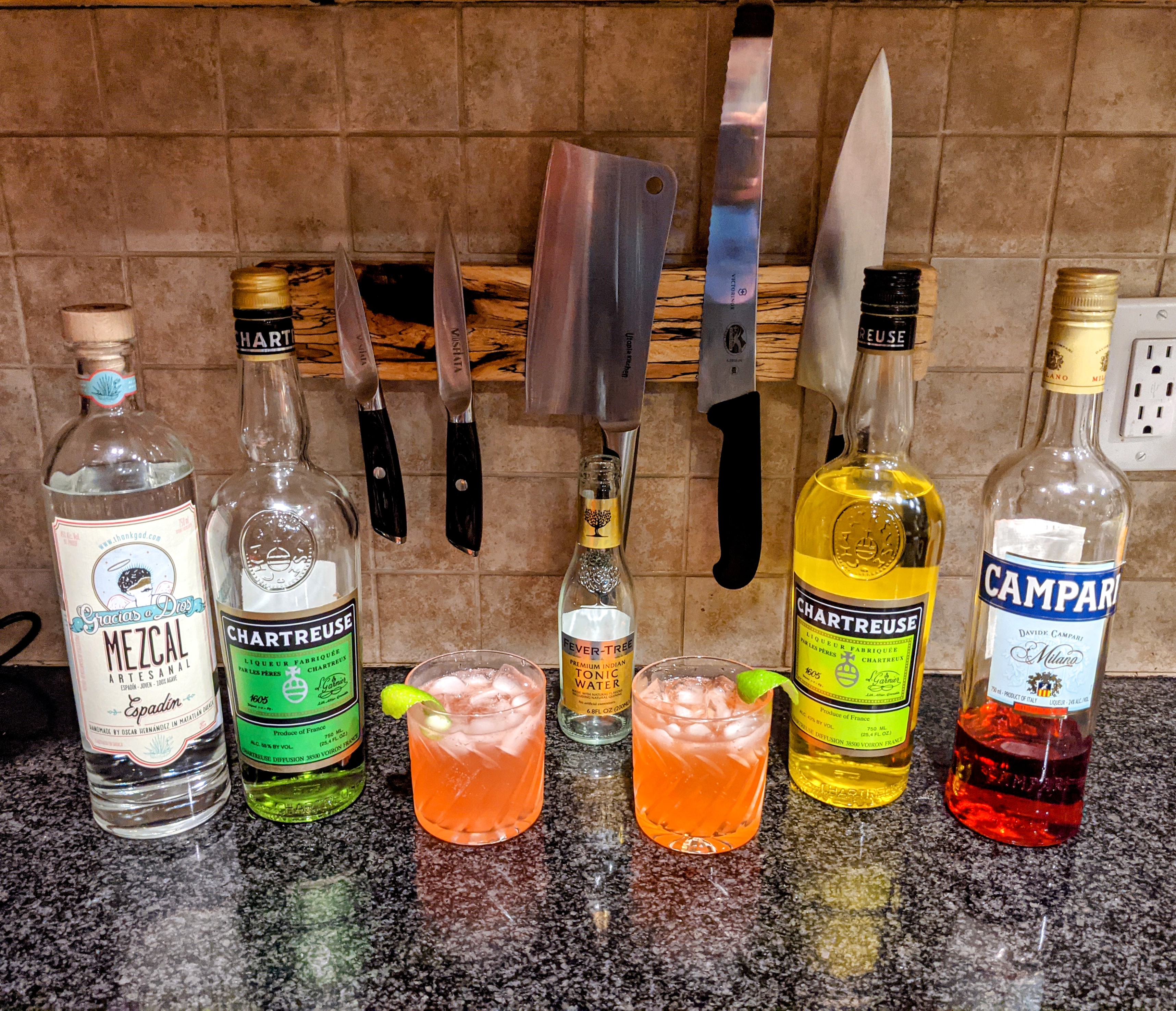 ½ oz mezcal ½ oz Yellow Chartreuse ½ oz Aperol ½ oz lime juice 3 oz tonic water Combine gently over ice and garnish.