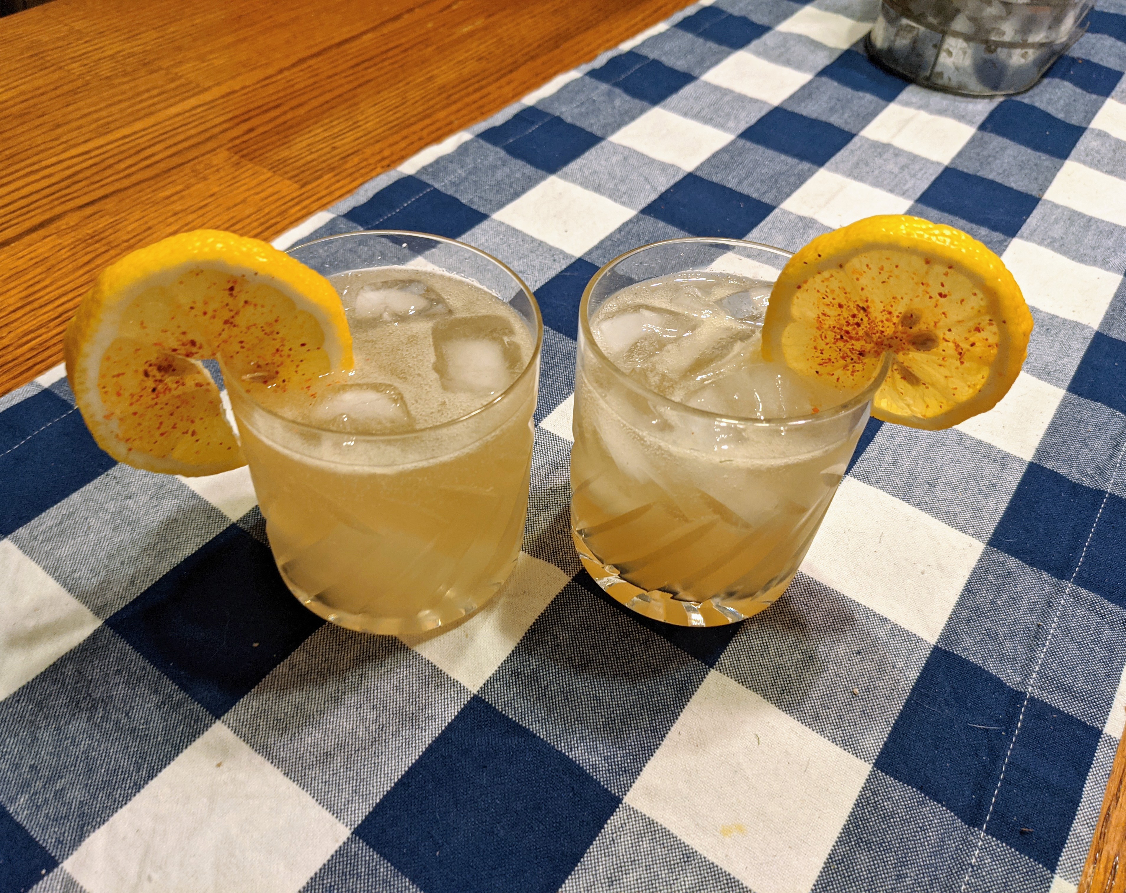 Shake everything (except the sparkling water) with ice, and strain into an ice-filled short glass. Garnish with a lemon wheel (dusted in chili salt, if you’re really fancy).